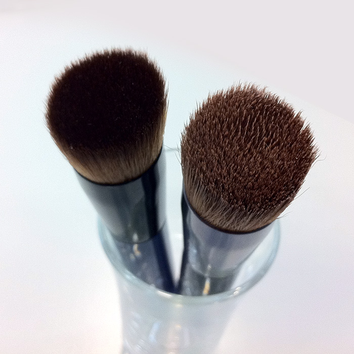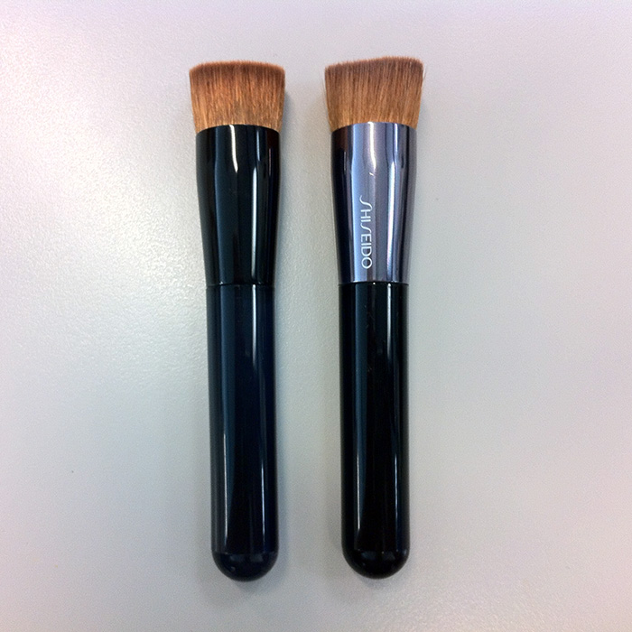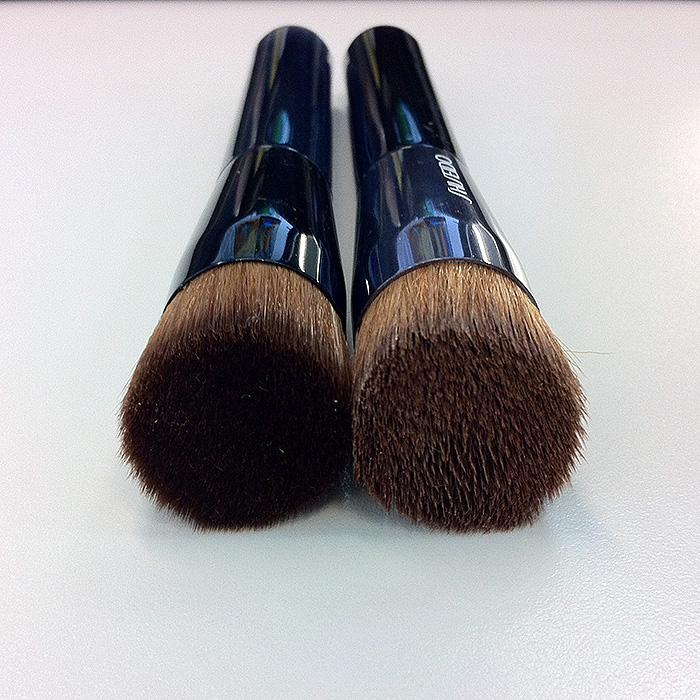 | 左:ファンデーション ブラシ 131 右:SHISEIDO時尚色繪尚質粉底刷 我先買了台灣資生堂國際櫃版的刷子(右),因為太好用又託人從日本帶回一隻。它乾(粉餅)、濕(粉底液、霜)底妝都可以使用,但連續混用容易結塊,所以基於此等薄弱理由,我又買了一隻。 它不像傳統的粉底刷每用過一次就必須清潔,即使使用過兩三次以後刷毛也不會乾硬。用一般沐浴乳清潔即可。 日本版跟台灣版是一樣的東西,但是價錢差很多。日本版日幣1890円(含稅)、台灣版定價NT$980. 長度一樣。毛量一樣。筆桿形狀一樣。 刷毛材質一樣。右邊顏色比較淺是因為有使用過,沾了一些粉底液的緣故。 不同的是:筆桿材質與"SHISEIDO"印刷的位置。 131筆桿是深藍色透明壓克力,SHISEIDO的位置在筆桿下方,而尚質是黑色不透明,SHISEIDO位置在筆桿上方。兩隻的質感都很好。 |