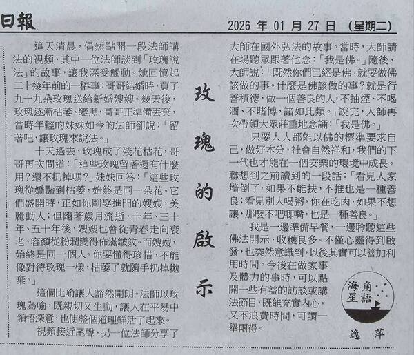 玫瑰的啟示 這天清晨,偶然點開一段法師講法的視頻,其中一位法師談到「玫瑰說法」的故事,讓我深受觸動。她回憶起二十年前的一樁事:哥哥結婚時,買了九十九朵玫瑰送給新婚嫂嫂。幾天後,玫瑰逐漸枯萎、變黑,哥哥正準備丟棄,當時年輕的妹妹如今的法師卻說:「留著吧,讓玫瑰來說法。」 十天過去,玫瑰成了殘花枯花,哥哥再次問道:「這些玫瑰留著還有什麼用?還不扔掉嗎?」 妹妹回答:「這些玫瑰從嬌豔到枯萎,始終是同一朵花。它們盛開時,正如你剛娶進門的嫂嫂,美麗動人;但隨著歲月流逝,十年、三十年、五十年後,嫂嫂也會從青春走向衰老,容顏從粉潤變得佈滿皺紋。而嫂嫂,始終是同一個人。你要懂得珍惜,不能像對待玫瑰一樣,枯萎了就隨手扔掉拋棄。」 這個比喻讓人豁然開朗。法師以玫瑰為喻,既親切又生動,讓人在平易中領悟深意,也使整個道理鮮活了起來。 視頻接近尾聲,另一位法師分享了大師在國外弘法的故事。當時,大師請在場聽眾跟著他念:「我是佛。」隨後,大師開示:「既然你已經是佛,就要做佛該做的事。什麼是佛該做的事?就是行善積德,做一個善良的人:不抽煙、不喝酒、不賭博,諸如此類。說完,大師再次帶領大眾莊重地念誦:「我是佛。」 只要人人都能以佛的標準要求自己,做好本分,社會自然祥和,我們的下一代也才能在一個安樂的環境中成長。聯想到之前讀到的一段話:「看見人家墻倒了,如果不能扶,不推也是一種善良;看見別人喝粥,你在吃肉,如果不想讓,那麼不吧唧嘴,也是一種善良。」 我是在一邊準備早餐,一邊聆聽這些佛法開示,收穫良多。不僅心靈得到啟發,也突然意識到,以後其實可以善加利用時間。今後在做家事及體力的事時,可以點開一些有益的訪談或講法節目,既能充實內心,又不浪費時間,可謂一舉兩得。