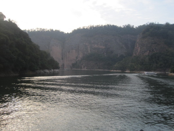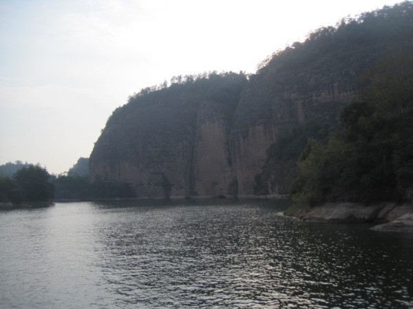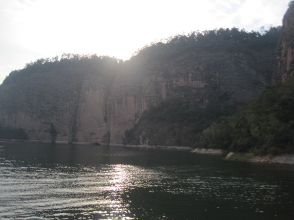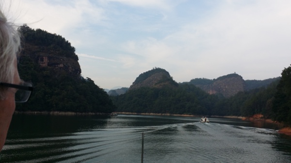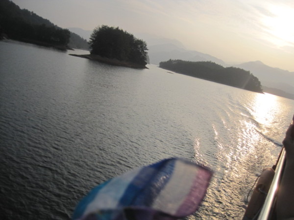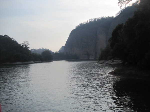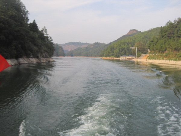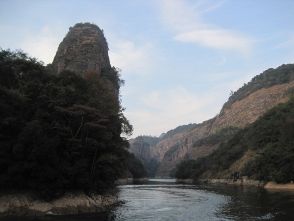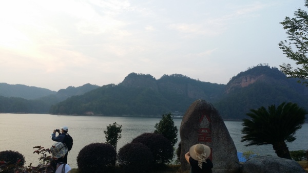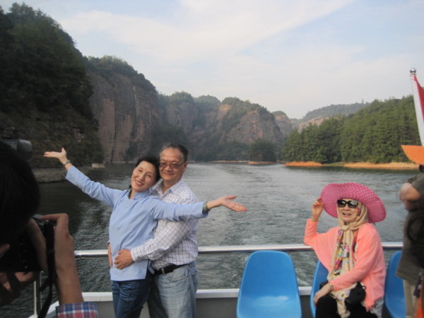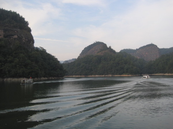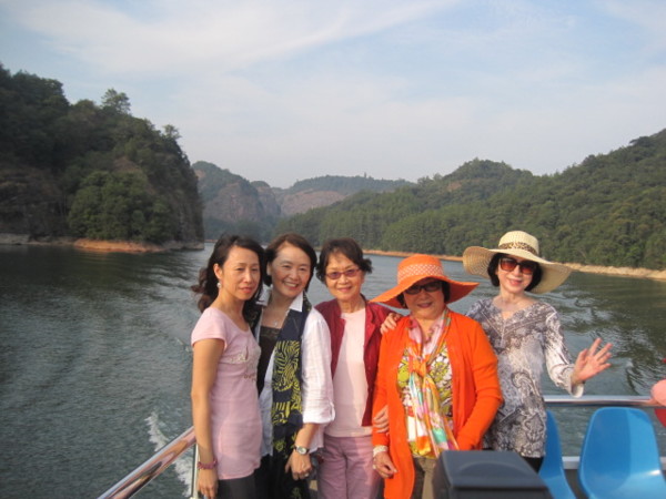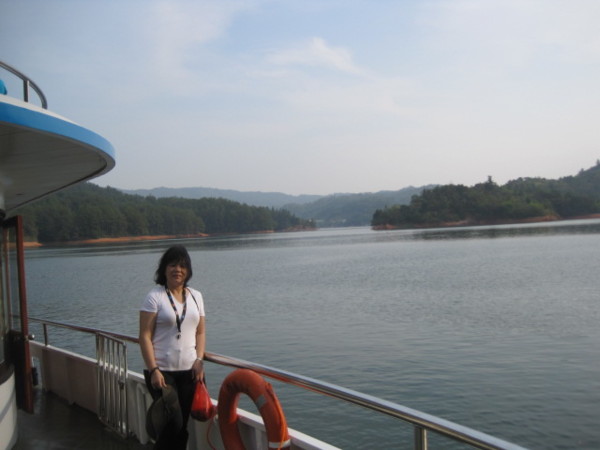 泰寧陽明山莊的早餐對我而言相當的豐富,因我是個蔬菜愛好者,但團裏幾位高頭大馬的老外,不知他們如何吃下這清一色素菜的早餐。這早餐甚至連一片午餐肉或一條熱狗(hot dog)都無,咖啡也無。外國人幾乎是無肉不歡,這樣的早餐定令他們叫苦連天,但娶華人為妻的老外大概早已被訓成半個中國人了! 孤陋寡聞的我是這次廈門行才首次聽到大金湖這三個字,上網一搜景色確實美。後跟泉州一些朋友談起,對大金湖他們皆耳目詳知,很多人已遊玩過,看來大金湖知名度已打響,現正沖向國際。 坐船遊大金湖,剛開始我們四人齊坐下層,邊聊邊觀看玻璃窗外美麗的湖光景色,後來我忍不住獨自跑到上層。這一上就舍不得下來了,景色更美,特別是迎著涼涼的秋風更賞心悅目。船行其間美景變換不斷,偶爾是湖面寬闊、偶爾又進入雙邊貌山奇麗的狹道湖面上,兩岸奇石異洞令人目不暇接。當前方現出四重山的景色時,眼前宛如一幅幅水墨畫,本來甲板上鬧哄哄忙著拍照擺美姿的一眾人,突然都靜下來了,都被眼前這自然美景給震撼了,太美了!美得令人疑神靜觀、忘了呼吸、忘了身處何方、忘了手中的相機,此時再怎麼拍也無法把眼前曠闊山靈水秀的美給拍下,只好盡情地欣賞,把美景盡量地嵌進腦海裏儲存起來,心中不斷贊嘆著:原來大金湖是如此的秀美! 以前到美國的太浩湖遊玩,平靜的湖面望不到邊,水連著天,湖水清澈見底,我歡喜得驚為天湖,此次見到大金湖周邊美不勝收的景色,不得不說太浩湖跟它沒得比。 後來船停靠一處山邊,我們徒步登上甘露岩寺,途中更見到一聳立平整大峭壁上仿佛有尊佛祖,很奇妙。甘露岩寺崁在懸空的山崖峭壁上,寺廟下只用一根柱子托起,好奧妙!(九)