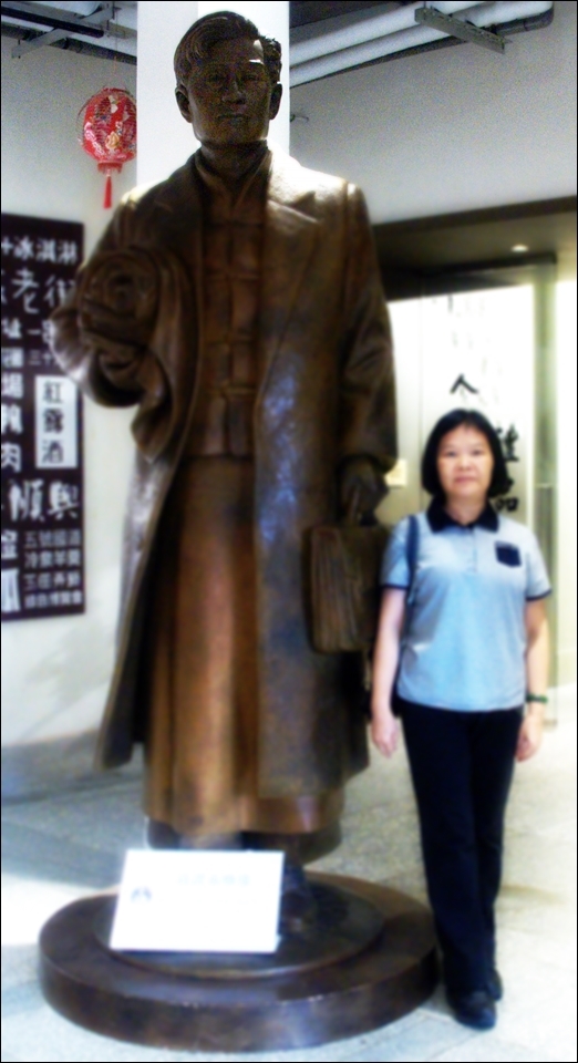 與蔣謂水的雕像合影