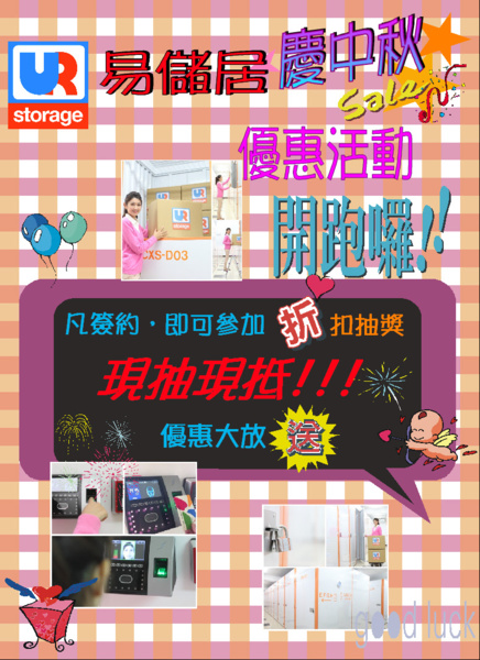 易儲居為慶祝中秋節,推出全新優惠方案: [凡簽約,就可以參加折扣抽獎,現抽現抵喔!!!] 超多優惠等你抽喔! 快來易儲居試試你的好手氣吧^^