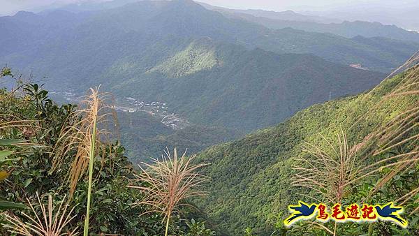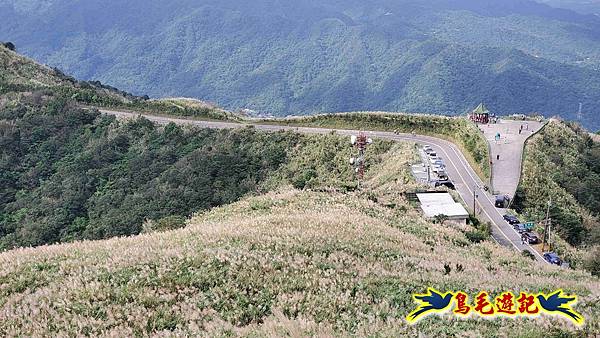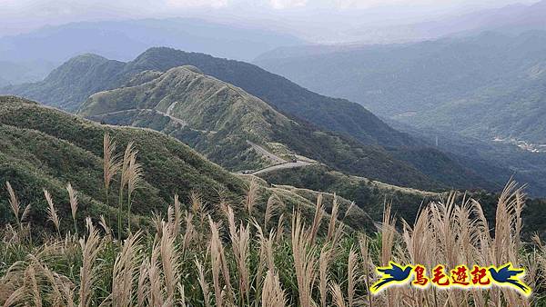 102公路旁也有許多芒花,山坡間盛開著金黃色台灣山菊,俯瞰左下角山谷可望見猴硐車站周遭聚落景色,