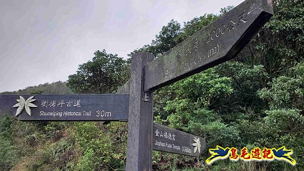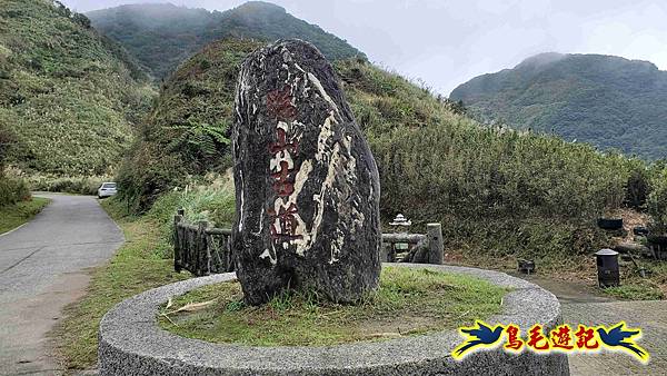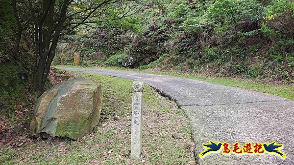 9:00右轉進入草山戰備道,雨勢變大,不厭亭至此已走2K,往金山福德宮還有1090M,在燦光寮古道石柱旁樹下暫歇避雨,