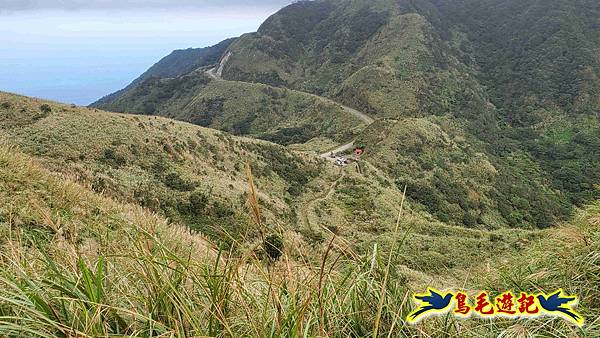 10:14轉為下坡,已可俯瞰102公路旁的不厭亭及三貂崙稜線,許多觀光族開車到不厭亭沒在爬山的,就只是看風景拍照而已...