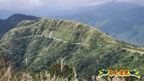 一小段平緩後轉為之字形漸往上爬,路況尚可,回望來時方向,隨著高度上升,視野更廣,
