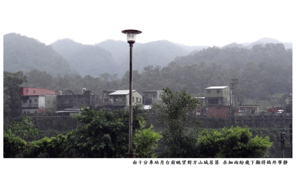 獨身行幽境 攝景入眼簾 溪聲奏相伴 清風吹面拂 這首詩在描寫一個人獨處的時候,隨性之所至,可以賞景可以聽溪。此中有深意,雖然別人不能理解,卻有清風溪聲來相陪伴。 菁桐只是一個小小煤鄉村落、重點放在菁桐火車站周邊拍照,體驗日式建築風情---太子賓館、菁桐老街等。 當天造訪太子賓館,不巧未營業,只好就外觀上拍攝幾張日式建築風情照當做留念吧。 平溪的天燈是聞名國內一項傳統藝術活動,其次就是平溪老街,非假日期間人潮較少,放天燈活動反而在十分火車站附近有比較多年輕人在書寫願望後,點火釋放天燈。 十分火車站前擠滿人潮,比平溪還要熱鬧,商家就分佈在鐵道兩旁,參觀時要注意人身安全。