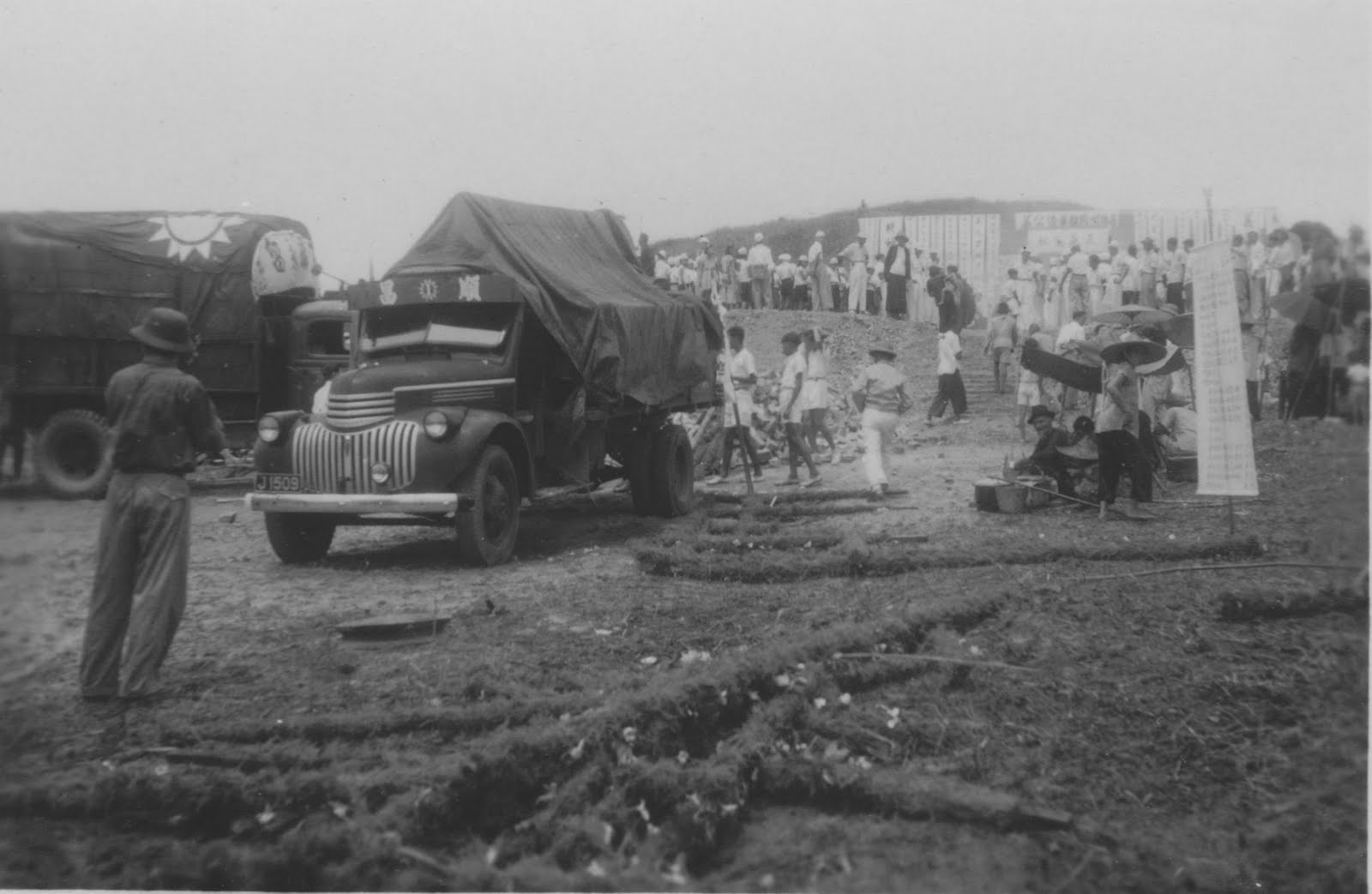 大卡車運送忠魂遺骸,以青天白日旗覆蓋。