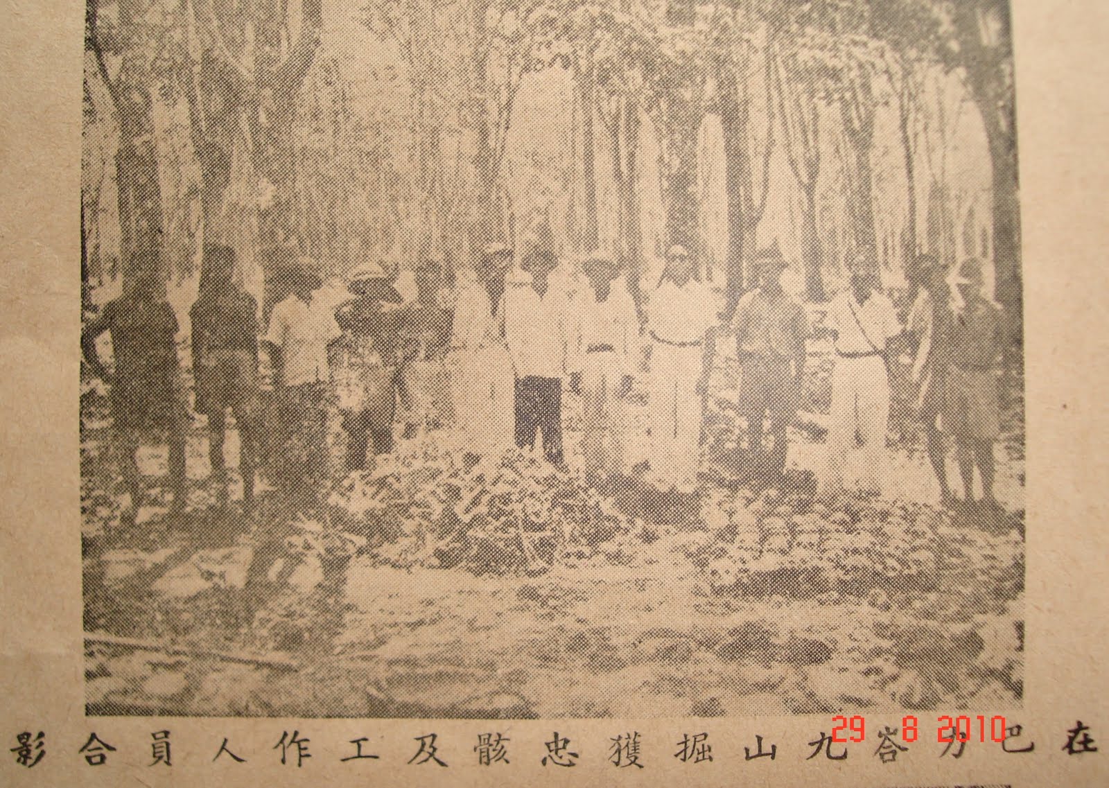 1946年8月25日,《麻屬華僑集體鳴冤委員會》派余金鑑、李尚賢和劉國七到巴力峇九豐興山負責挖掘忠骸 工作,獲遺骸百餘具,分儲七大甕。