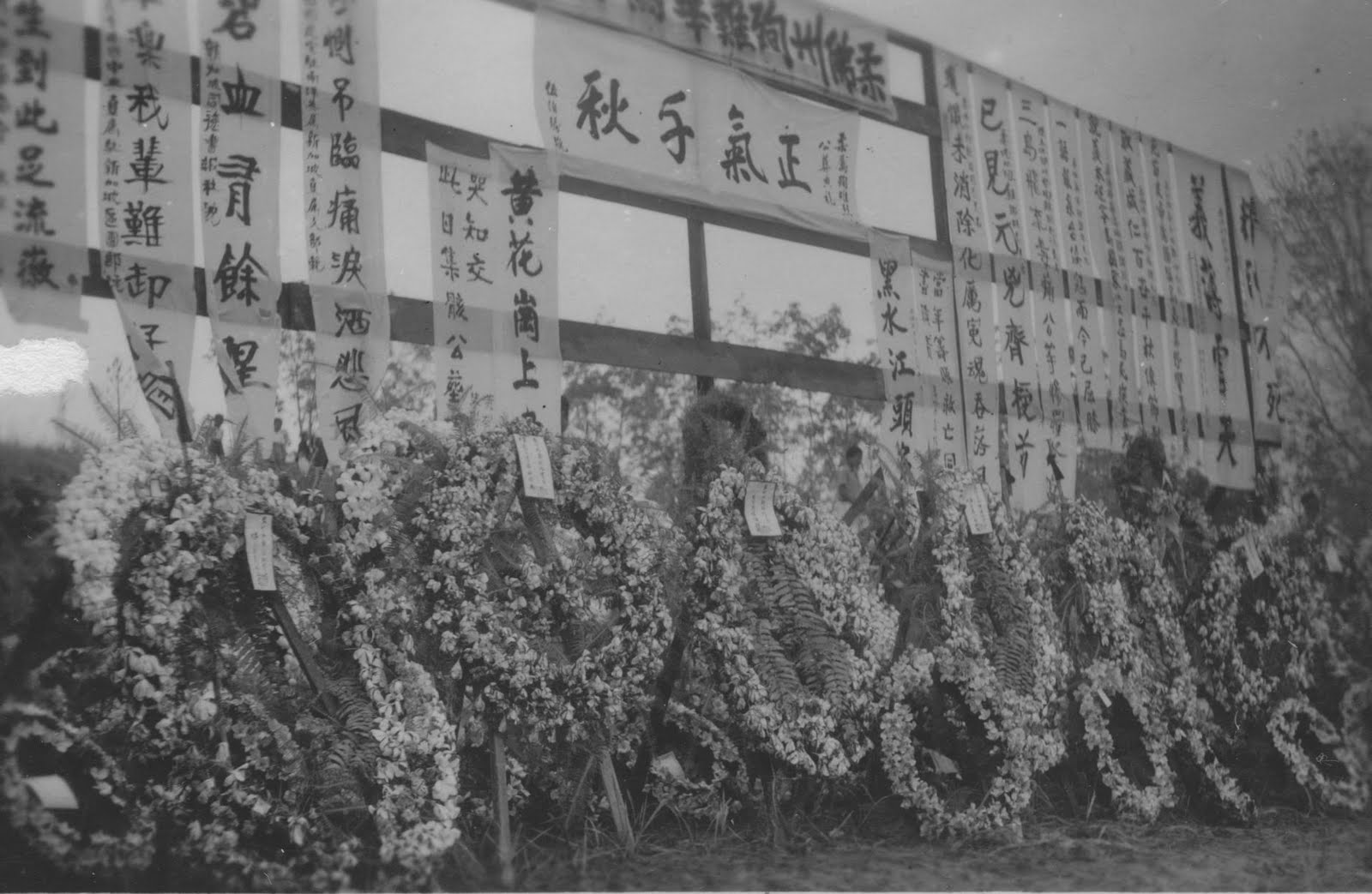 祭壇上置靈牌,清香三炷,清花鮮果。由中六槍死裡逃生之周細粒所獻心形花圈最為特出,中間《哀哉》二字是用殉難烈士遺像嵌成。