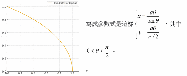 這一夜的徘徊,註定只是一個開始。 他靈魂的幾何圖形,正被這兩種力量拉扯、變形,或許,也將在這種張力中,被鍛造出全新的形狀。 此刻的他,仍只是個青年的旅人,舉目仰望星空,胸中充滿矛盾的火焰。 後記 : 希比亞斯的化方曲線不是代數曲線(不能由有限多項多項式方程描述),而是一條超越曲線。 長這樣: