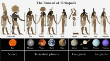 後記: 赫利奧波利斯的Ennead(九柱神): 太陽神拉 (Ra)、風神舒 (Shu)、雨神泰芙努特 (Tefnut)、天空女神努特 (Nut)、大地之神蓋布 (Geb)、冥王歐西里斯 (Osiris)、魔法與生育女神伊西斯 (Isis)、戰爭之神賽特 (Seth) 和死神奈芙蒂斯 (Nephthys)。 |