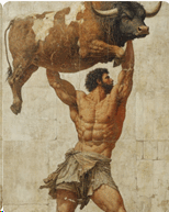 然而今天,他來到這裡,不是為了講學。 他在聽。 沙地中央,一名男子正獨自訓練。 那是一種近乎儀式性的舉重。 粗糙的石塊被他抱起、停留、再緩緩放下;呼吸與動作完全一致,沒有任何多餘的爆發。 每一次重複,都像在測量自身的極限,而非挑釁它。 「那就是米羅。」身旁有人低聲說。 畢達哥拉斯點頭。 他早已知道這個名字。 六次奧林匹亞勝者、克羅頓的驕傲、戰場上以肉身穩住陣線的勇士。 傳言誇張得近乎神話:他能以單手提起公牛,能讓敵人望見他便心生怯意。
