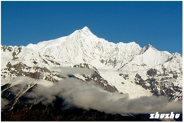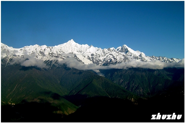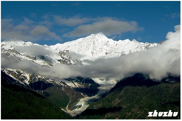 玉帶雲之下,則是冰斗、冰川連綿,猶如玉龍伸延,冰雪耀眼奪目,是世界稀有的海洋性現代冰川 藏族認為,每一座高山的山神統領一方自然 「明永」如銀麟玉甲的長龍,從海拔6740公尺的梅里雪山往下一直鋪展到2600公尺的森林地帶