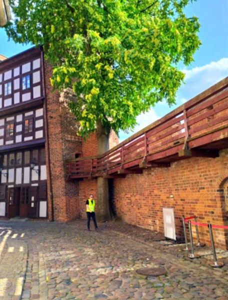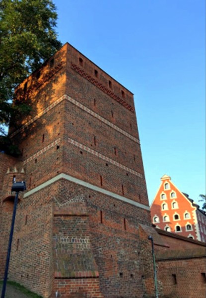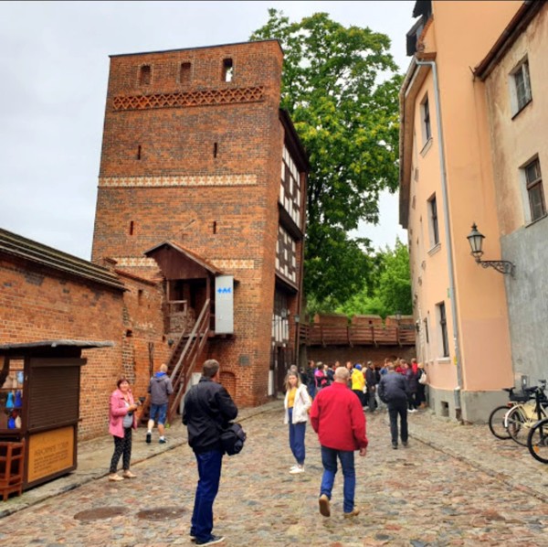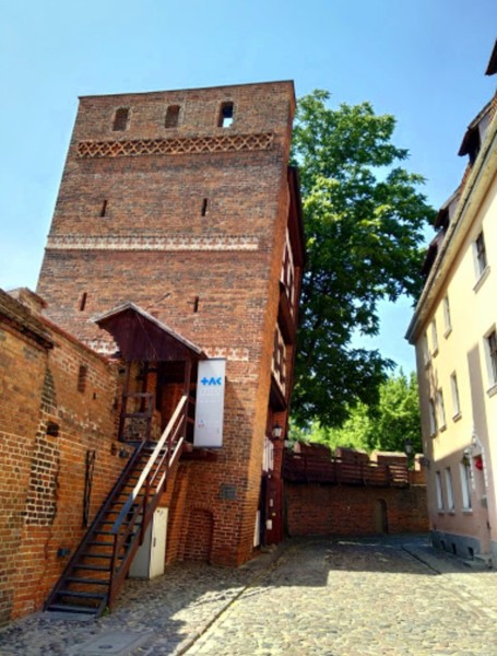 在進托倫老城前,要先經過維斯瓦河上的鐵橋;旅遊巴士停在要塞前的停車場,時序深秋,要塞前一片秋意楓紅,美不勝收(可惜記憶卡損壞,痛啊)!托倫要塞 是1233年條頓騎士團在此修築的城堡,原本是騎士團的一個駐紮點,是征服普魯士和感化普魯士的歷史象徵,這就是托倫城產生的雛型。托倫要塞又稱為條頓騎士團城堡,位於維斯瓦河畔;不過由於抗議條頓騎士團過往的高壓統治,當地托倫居民於1454年摧毀了這座城堡,如今僅存斷垣殘壁和部分的城牆。 托倫的條頓騎士團城堡其實很小,目前基本只是廢墟一個。緊鄰條頓騎士團城堡廢墟的是一間酒店,酒店的窗戶是鮮豔的綠色;廢墟圍牆外面還有一個足球場,現場有人正在那裡踢球。條頓騎士團城堡上可以看到維斯瓦河的美景,城堡緊貼著老城的東部,同時帶動了新城的發展,整座托倫城市處處都流露出城堡的特色。條頓騎士團城堡門票10波幣,會拿到一份很詳細的介紹。 條頓騎士團城堡裡面有他們的靶場、樓塔,騎士們使用的各種武器展示,還有一個死刑犯處決的斷頭台裝置,有些遊客把頭放進去很有意思。城堡曾經是十字軍三大騎士團之一的條頓騎士團的總部,在東歐歷史上曾寫上濃重的一筆。城堡當時是以聖母瑪利亞聖母(Virgin Mary)來命名這座城堡為「Marienburg」,字面意思就是「瑪麗的城堡」。1309年9月14日,齊格弗里德·法持萬根團長(Grand Master Siegfried von Feuchtwangen)將德意志條頓騎士團的總部,搬到了馬爾堡城堡,讓馬爾堡城堡升級為當時南波羅的海沿岸最具權力中心之一。 條頓騎士團城堡裡面有很多關於十字軍的壁畫,這些壁畫形態生動逼真,如果對中古歷史感興趣的話,可以花點時間在這裡看這些壁畫。13世紀末,托倫加入漢薩同盟,成為中世紀重要的貿易中心。但是到1466年,波蘭-普魯士聯盟在13年戰爭中打敗了條頓騎士團,托倫才回歸波蘭王國版圖。18世紀末,托倫在第二次瓜分波蘭中,又成了普魯士的領土;直到第一次世界大戰之後,才被劃給獨立的波蘭,二戰期間曾是德國的佔領地,所以這裡是個政治變動頻繁的地方。 從維斯瓦河就能看得到城堡的大部分,條頓騎士團城堡外圍可以免費參觀,進入城堡的核心區才需要購票;城堡內有博物館,不過大部分都已是廢墟。條頓騎士團城堡也許有其歷史價值,但是就觀光目的而言,可看性確實不高;喜歡研究十字軍東征及中古騎士團的歷史,可以考慮附近還有一個馬爾堡,反而豐富精彩些。 現今,條頓騎士團城堡在維瓦斯河的一側,還保存有完整的古城牆,城牆上有多個著名的城門。最有名的是修道院城門,名字來源於曾經矗立於此的伯納丁聖靈修道院;修道院已於17世紀,被入侵的瑞典軍隊摧毀。傳說當年曾發生飢荒,修道院的一位年輕修女,在庫房中發現了裝滿薑餅麵團的圓桶,這些麵團烘烤出來的薑餅,挽救了成千上萬托倫市民的生命,也造就托倫薑餅的傳奇。 穿過修道院城門,即可見左邊有一個傾斜得很嚴重的防禦塔,讓人聯想到義大利的比薩斜塔。防禦塔高15公尺,最初是直立的,後來由於河邊地層不穩而逐漸傾斜,而成為奇景,已成為托倫老城的象徵。在18世紀,斜塔還作為女子監獄,後來又成為鐵匠的作坊。目前,斜塔內是紀念品店和咖啡館;以致來托倫斜塔,將其視為古蹟一部分的人並不多,來此拍照、喝咖啡的人反而較多些。 傳說中,該塔是一個名叫胡貢的人所建,他愛上一個美麗的托倫女子,托倫女子在維斯瓦河冰層上奔跑時,掉入水中,胡貢緊隨其後但未能救得情人;他自責不已,於是修建了斜塔作為懺悔。拍照時,發現幾乎所有去托倫斜塔的情人們,都試圖背靠斜塔站著;領隊解釋說,因為傳說誰能背靠斜塔站直,誰就能馬上結婚。 條頓騎士團城堡保存最完好的「橋門」,建於1432年,是在原有城門基礎上重建而成;最初這裡是維斯瓦河的渡口,後來這裡建起了托倫的第一座橋樑,因此這座城門就取名為橋門。它是這幾座城門中建造技術最先進的一座,弧形的外牆,可以有效減輕火砲衝擊的影響,方形的牆洞處則可以放置防禦性的大砲。 這裡也是整個城牆段地勢最低的地方,因此成為防禦洪水的最佳風向標;在大門上,還能見到曾經的河水水位記錄。在城裡看橋門,是白色的防禦塔樓,很有中世紀的浪漫色彩。同一座橋門,裡外卻是完全不同的風格,讓人讚嘆。城牆中段的大門是水手之門,於19世紀重建而成;這座大門是通往老城中央廣場的主要入口。當年波蘭國王來訪之時,就是從這裡進入老城,穿過水手街,到達舊市政廳的;正是如此,水手街又被稱為皇家大道。 托倫古城牆上除了城門,還有幾個塔樓。有一座塔樓叫鴿子塔,在19世紀托倫歸屬普魯士統治期間,普魯士軍隊曾經將這座塔樓,用於飼養信鴿的鴿舍;這些信鴿為城市間信息交流提供了便利,這座塔也因此而得名。另一個塔樓上吊著巨大石塊,在中世紀是阻擋敵人進攻的重型武器。 要了解條頓騎士團城堡其後的發展,就先要了解第一次托倫和約的簽訂;這個條約是波蘭-立陶宛聯盟與條頓騎士團國之間戰爭的和約。1411年2月1日,和約在條頓騎士團國最南端的城市托倫簽署;這個和約在歷史上,通常被認為是波蘭-立陶宛聯盟外交上的失敗。因為波蘭-立陶宛聯盟未能充分地利用1410年6月的格倫瓦爾德戰役中,對騎士團的決定性勝利所造成的形勢。 第一次托倫條約簽署後,條頓騎士團將在戰爭期間佔領的多布任地區歸還波蘭王國,並將