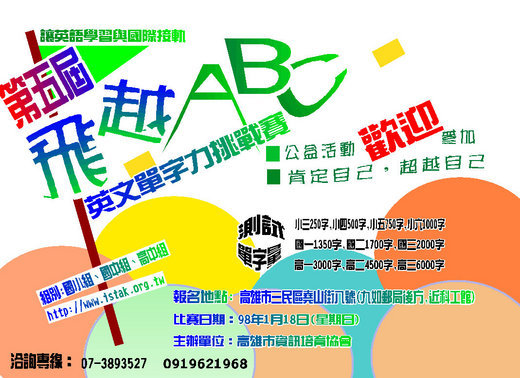 第五屆【飛越ABC】--英文單字力挑戰賽,鼓勵同學參加 二、主辦單位:高雄市資訊培育協會(高市社局一證字97092號) |