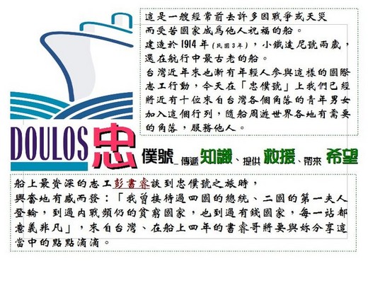 社會服務》忠僕號要回來了! 各位志工夥伴: 年假剛結束,便收到令人興奮的訊息,"忠僕號"回來了!!夥伴們!我們又要聚在一起為"忠僕號"加油了!原定2007年做最後一次訪台,並將於2010年除役,全世界最大的海上書局"忠僕號",因應行程更改,將在今年 今次行程將分別停留在高雄港、花蓮港及基隆港。詳細日期如下: 高雄 這次支援忠僕號的情形大致跟2007年時相若,主要分為兩部分: (一) 隨隊翻譯志工(需外語能力良好) 船到達後將派出小組到當地醫院、孤兒院、安養院及街友中心等地進行訪問。每次活動需兩名隨隊志工協助進行即時口譯的工作。時間一般來說會在上午十時至下午四時期間。 目前忠僕號前置小組剛抵台,正和有關部門中心聯絡中,故此暫未能提供確實探訪活動日期。但活動會在船停留當地港口期間內進行。也因此報名的夥伴必須考量個人能否參與週一至週五之服務才報名,以免日後產生不必要之困擾。 服務日期: 高雄: 花蓮: 基隆: 服務時間:上午十時至下午四時 此項目報名以每日為單位,因此假若閣下只可以在其中一天參與也可以報名。 (二) 民眾諮詢志工(無需外語能力) 協助忠僕號志工回答民眾詢問及秩序之維持。 服務日期: 高雄: 四月十一日(星期六)、四月十二日(星期日) 四月十八日(星期六)、四月十九日(星期日) 四月二十五日(星期六)、四月二十六日(星期日) 花蓮: 基隆: 五月二十三日(星期六)、五月二十四日(星期日) 五月三十日(星期六)、五月三十一日(星期日) 服務時間:上午十時至下午六時、服務需求:每班二十五人 此項目報名以每日為單位,因此假若閣下只可以在其中一天參與也可以報名。 假若你能協助有關服務的夥伴,請把姓名、手機號碼、E-mail、可協助日期及種類電郵至 flsv@livemail.tw。 李 洛 團長 敬上(Victor 呂政翰(秘書) 代行) 二00九年二月五日 外語志工團 Foreign Language Speaking Volunteers 詳情請參閱http://www.wretch.cc/blog/flsv 本志工團歷年來服務的相關內容請參閱