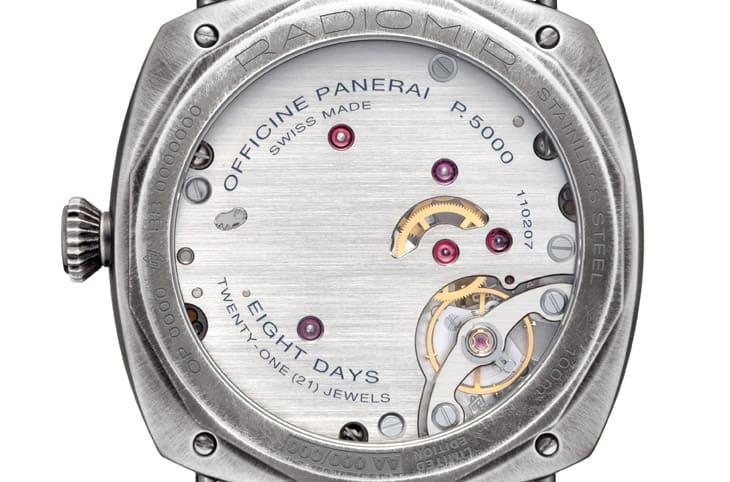 ▲上半部羅馬數字、下半部中文時標的加州面盤設計,搭配黑灰漸層與藍鋼指針,展現文化融合與懷舊韻味。 面盤色調由黑色漸層至碳灰,低調卻富層次,配合軌道式分鐘刻度與幾何時標設計(包括3、6、9點鐘位置的橫矩形、12點鐘的倒三角形),整體格局俐落又富節奏感。指針採拋光藍鋼製作,藍色並非塗漆,而是透過約300°C的精密加熱氧化而成,不僅色澤純淨,也提升了耐蝕性,指針與時標上塗覆的米色Super-LumiNova® X1夜光塗層讓面盤在暗處綻放柔和綠光,同時呈現略帶復古的舊化氛圍,呼應Radiomir系列一貫的軍用血統。 鏡面部分則採圓弧形藍寶石水晶,有點致敬早期軍錶使用的Plexiglas樹脂玻璃的味道,這樣的設計既向歷史致敬,也讓光影折射更自然,增添復古味道。藍寶石底蓋下可見P.5000手動上鍊機芯的結構之美,這枚自製機芯擁有長達八日的動力儲存,靠的是雙發條盒設計,讓佩戴者無須頻繁上鍊,機芯震頻為每小時21,600次,擺輪橋採橫跨式結構,確保穩定運作與良好抗震性,是沛納海經典的長效動力方案之一。