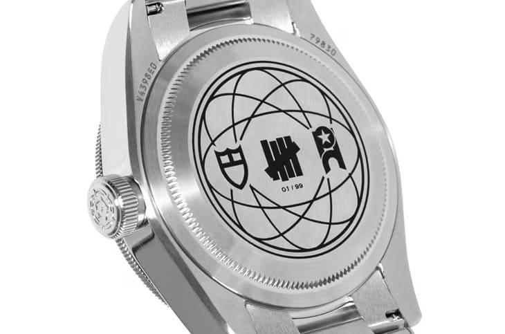 ▲黑色面盤6點方向有金色雙品牌標誌,下方藏有「世界時光機」字樣,低調融合街頭與東方文化。 真正讓這只錶與眾不同的是面盤細節,黑色面盤在6點鐘位置首度出現雙品牌字樣——PHANTACi與UNDEFEATED,兩者以金色呈現,低調卻極具存在感。更耐人尋味的是下方那行白色中文字樣「世界時光機」,巧妙點出GMT功能,同時替整體設計注入東方文化,乃至周董的經典名曲。這樣的處理方式不張揚,卻讓懂的人一眼就懂,也正是親友限定作品最迷人的地方。 翻到錶背,收藏價值的訊號變得更加直接,雷射鐫刻的圖案以類原子結構的形式呈現,三方品牌Logo被整合在中心位置,每一只手錶都擁有專屬編號,清楚標示其在99只中的獨立身分,這是一種對「少數人擁有」這件事的默契確認,也讓這只錶從工具,升級為紀念物。